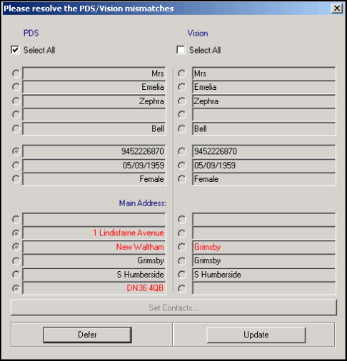 For patients whose local demographic details do not match the Spine, a PDS/Vision Mismatch is displayed each time the patient is selected until the PDS mismatch is resolved. If you choose to defer a mismatch, a SCR/PDS synchronisation is done automatically. If the patient is successfully synchronised "Identity Confirmed" is displayed in Consultation Manager, see SCR PDS Synchronisation for further details. If unsuccessful, the patient is "Unlinked" and SCR updates cannot be sent until the mismatch is resolved.