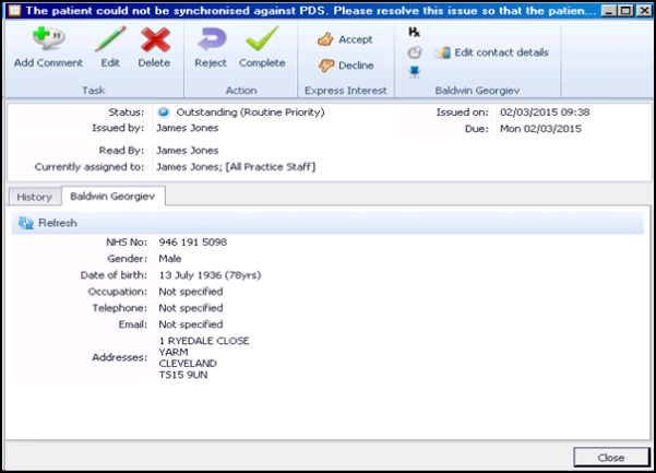 Daybook Task - The patient could not be synchronised against PDS.