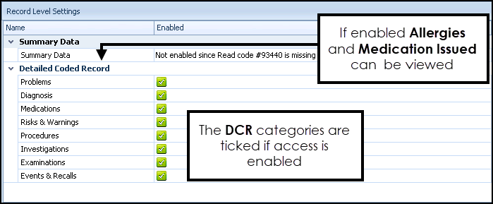- DCR - The Detailed Coded Record (DCR) categories accessible by the selected patient.
