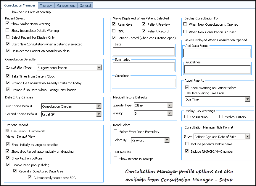 Profile options specific to Consultation Manager can be set up in the Consultation Manager tab: