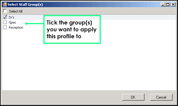 - Either tick Select All or tick the staff groups you want to allocate the selected profile to.