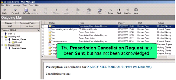 When an electronic prescription is cancelled, a message is transmitted to the Electronic Prescription Service in a Parent Prescription Message. On receipt of the cancellation request message, an acknowledgement is sent back to Vision which automatically updates the message in Mail Manager to Complete.