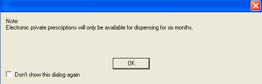 When adding or re-authorising an EPS R2 eligible repeat that is also private, you are prompted with the following message: Electronic private prescriptions will only be available for dispensing for six months. Select OK to continue.