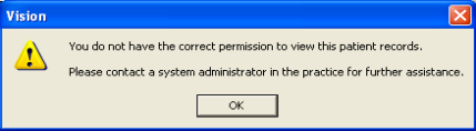 However, if you do not have permission to access a patient record, each time you select the patient you will be unable to open the patient record and will receive the following warning message: