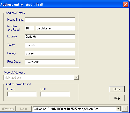 The screen is similar to the Patient Details screen with a window at the bottom of the screen displaying the date the record was written. Use the scroll arrow to select different dates to see how the record has changed, if at all.