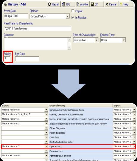 In the example below, the exporting practice have set their Export Priority 7 to map to the "Operations" External Priority. This means that medical history with a priority 7 is defined as an operation.