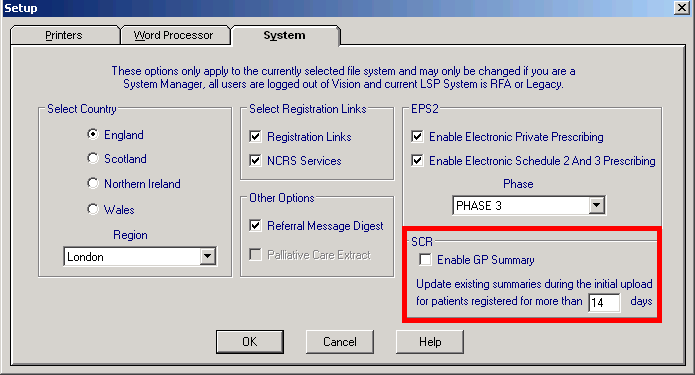 4. Set how long, in days, a patient must have been registered with the practice for the initial upload to overwrite any pre-existing summary with fresh data. The default is 14 days but you can choose between 0-99 days, type the required number of days for the statement "Update existing summaries during the initial upload for patients registered for more than nn days".