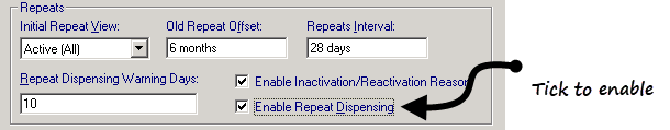 3. From Repeats Interval:,you can select your own default period for repeat dispensing batches, the default is 28 days. For example, to change to thirty days, overtype 30D.
