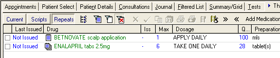 • Repeat dispensing issue - one of the issues printed from a repeat dispensing prescription - viewed from the Scripts tab of Therapy.