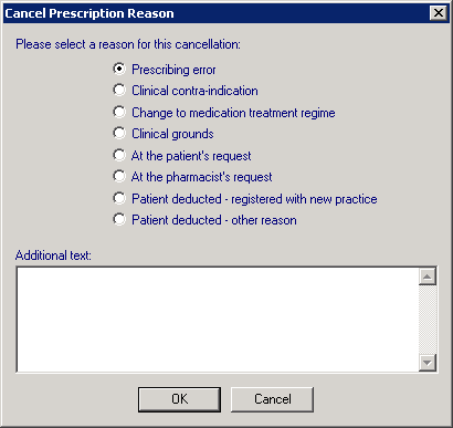 - Select Yes and the Cancel Prescription Reason screen displays: