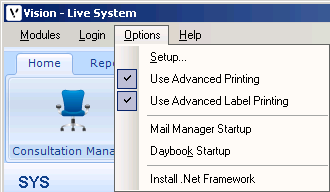 To enable Advanced Label Printing, from the main Vision screen select Options – Use Advanced Label Printing.