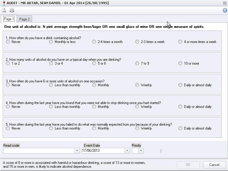 Many questionnaires are available to help the clinician assess the patient. The answers provided by the patient allow the clinician to quantify and scale severity, and then add the result along with the relevant Read code onto the patients record. The questionnaires all work in the same way, following a published algorithm to convert the answers given into a score. The Clinician can either turn the computer monitor to face the patient and allow them to make their own selections, or the clinician can ask the patient and record the answers given.