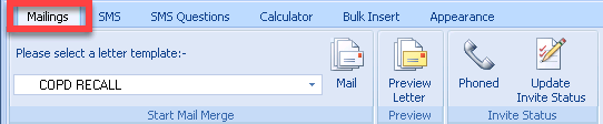 To perform a Mail/SMS Merge, highlight a line on the Alert popup screen and either right click and choose Merge or select Mail Merge