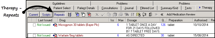 1. From Consultation Manager - Therapy - Repeats, remember to select Filter Inactive Repeats if required.
