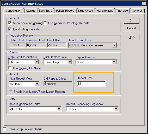3. Enter the maximum number of repeats anyone in your practice can authorise in Repeat Limit. By default: