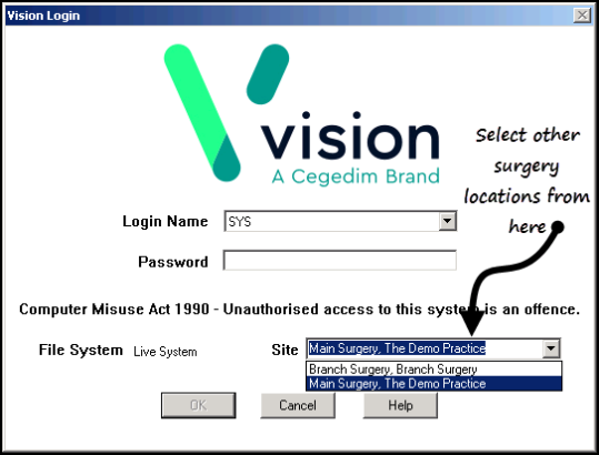 From the Vision 3 Login screen, select Site.