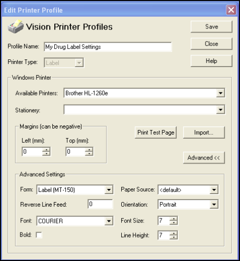 - Page Height - Form feed. Only visible under Windows 95 (1/10 ths of a mm). The default is 2169 for scripts, 381 for labels.