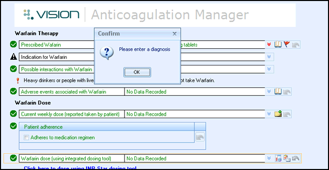Before patients can have their INR monitored and Warfarin dose adjustment calculated, they must first have a current Diagnosis Indication. This is done on the INR/Warfarin Diagnosis screen. If you have not already recorded the Warfarin/INR Diagnosis Indication a prompt displays when you select the Warfarin dose icon.