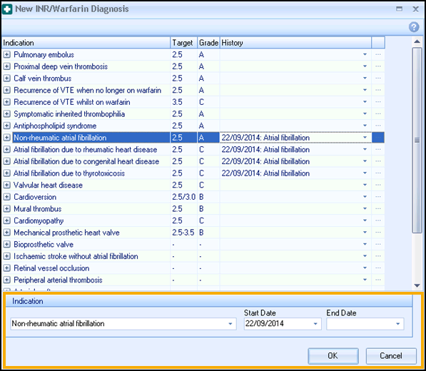 Note - If you record an End Date against a Diagnosis Indication you cannot dose after this date. To continue dosing the patient you need to record a new Diagnosis Indication. Patients with an End Date are also removed from the Anticoagulation Reports.