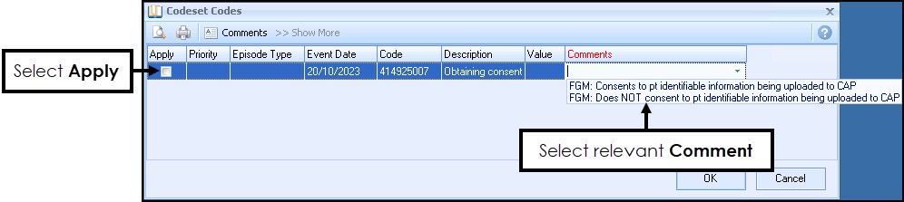 - Select the clinical term, simply tick Apply next to the required codeset code and then select the relevant freetext comments: