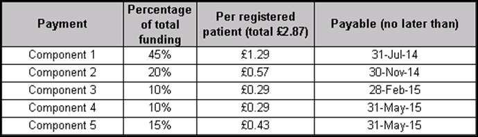 Payment is based on a maximum of £2.87 per registered patient, with the payment based on achievement of each quarter's requirements:
