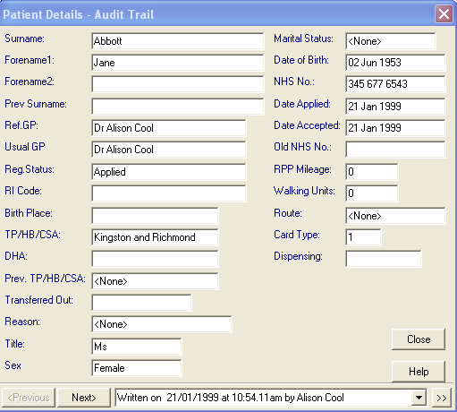 The Audit Trail screen shows any changes made to the patient's details.