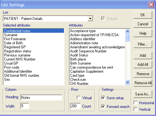If, for instance, you want to include the Second Forename in the list, find this under Attributes in the right-hand pane, and highlight it, then click on Add. It is then placed in the left-hand Selected Attributes pane. Click OK. This then becomes an additional column on the right of the Select Patient browse list.