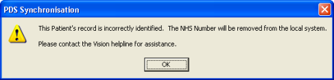 If however a number in use locally has been invalidated nationally (due to the resolution of a data quality investigation) then upon synchronisation the PDS indicates that a Patient’s NHS number is invalid, a warning displays informing you that "This Patient’s record is incorrectly identified. The NHS number will be removed from the local system. Please contact the Vision helpline for assistance.". The record will be decoupled from PDS.