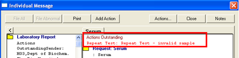 View Result displays the details of the currently selected message. The options from here are File All, File Abnormal, Print, Actions and Notes. The Header tab shows details of the transmission, and the Audit trail shows the sequence of events.