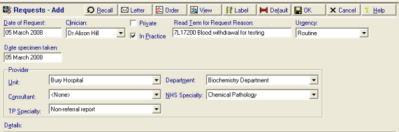 lets you create a default request from your current details, so this can be selected in the future (see Default Requests). - Before clicking OK, optionally click on the Label button