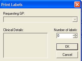 . This both prints the label(s) and records the request. - Or select Add – Request – Print Specimen Labels. This just prints the label(s) without recording a request. If no prior request is entered, this just prints the patient's name and their date of birth, with no clinical details