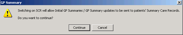 - You are prompted "Switching on SCR will allow Initial GP Summaries/GP Summary updates to be sent to patients' Summary Care Records. Do you want to continue?" Click Continue.