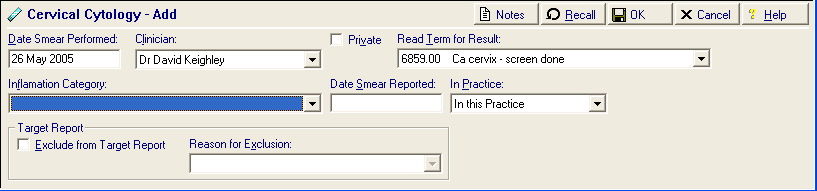 - Date Smear Performed - This defaults to today's date. The idea is to allow the nurse taking the smear to make a quick entry by selecting Add – Cytology, then pressing OK to accept the defaults.