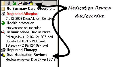 When a medication review is due or overdue the text is highlighted in yellow and it is indicated by the following icons :