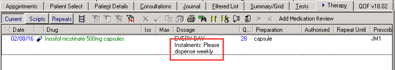 The text is also printed on the prescription in the endorsement area with <I> to indicate instalment dispensing.