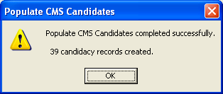 - After the population has finished, a confirmation message appears informing you that the population has completed and the number of patients that have been flagged as suitable or unsuitable for CMS (Serial Prescribing).