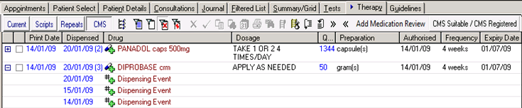 symbol. You can view the date of the last CMS (Serial Prescribing) dispensing event from the CMS filter in the Therapy tab. The number of dispensing events displays in brackets next to the CMS (Serial Prescribing) Item. You can look at each dispensing event by selecting the + next to the CMS (Serial Prescribing) item. These are read only entries and do not display in the Scripts filter.