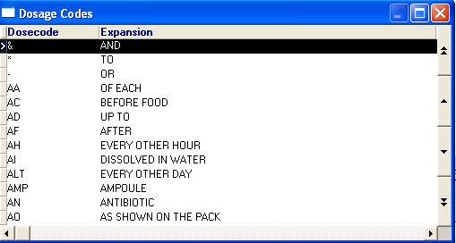 Or select a Dosage Code - point to the Dosage window, and click with the right mouse, then select Dosage Codes, List to remind yourself of the currently available abbreviated dosage codes. Scroll and double click on the code you want. Repeat as required. While in the list, you can use the right mouse button to edit, add or delete dosage codes.