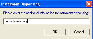 In the Instalment Dispensing window, enter the required free text instructions for instalment dispensing: