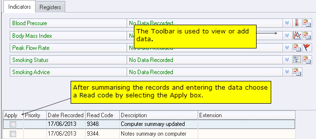 The Indicator screen enables you to record readings and measurements. You can also choose which Read code you want to use to indicate that you have summarised the clinical record.