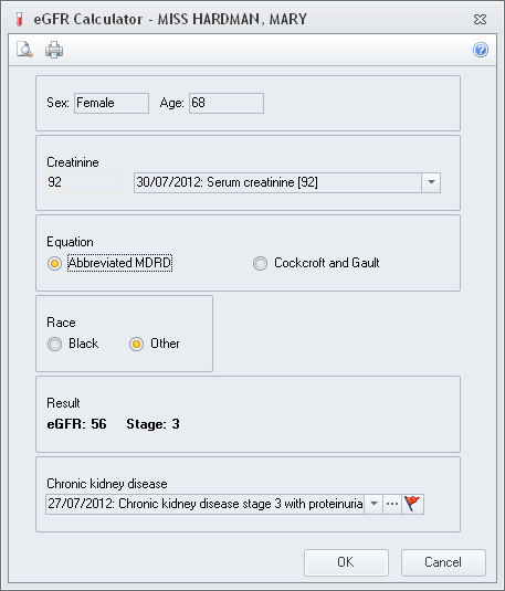 The Sex, Age and any previously recorded Creatinine levels for the patient are displayed (you can also type in the Creatinine result, but this is NOT recorded within the patient record). You can then choose the Equation type – either Abbreviated MDRD or Cockcroft and Gault. If you choose the former type, you will need to specify the Race of the patient.