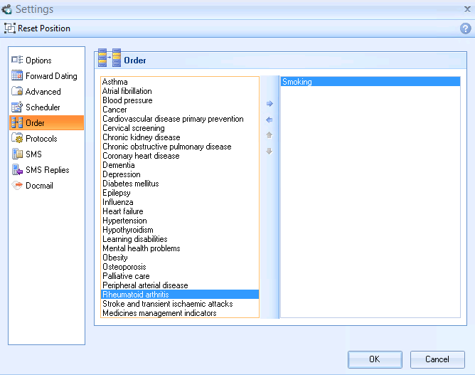 The Order tab of the Settings screen can be used to alter the order of the Contract Indicators. Normally the Contract Indicators are ordered alphabetically. By moving some or all of the Contract Indicators from the left hand column to the right-hand column you can specify the order and bring more important indicators to the top of the list. Any Contract Indicators that are remaining on the left hand side of the screen are placed at the end of the list in alphabetical order. By default all Contract Indicators appear alphabetically in the left hand list, and are also displayed in this manner.