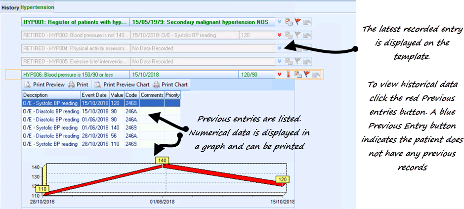 The latest record is always displayed on the Template screen but you can look at historical data and where appropriate graph the information. The red