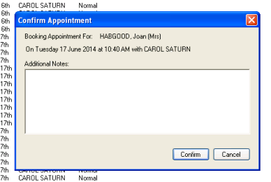 - Double-click a slot to book. The Confirm Appointment screen displays: