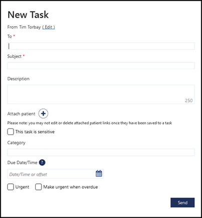 This section displays all outstanding tasks for a patient ordered by urgency then due date. To add a new task click Add Task