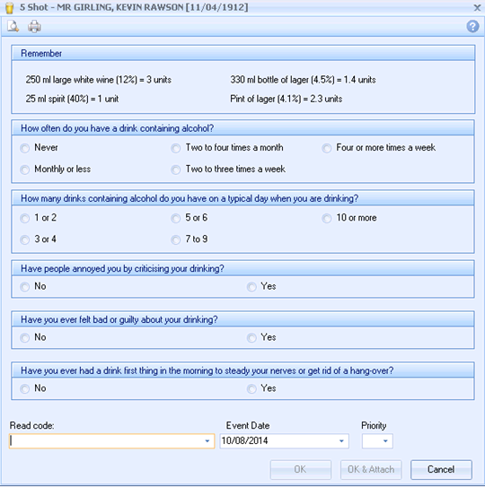- Complete the questionnaire by selecting an option under each heading. On completion of all the questions the Read code 38Df - Five-shot questionnaire on heavy drinking displays along with the patient's score.