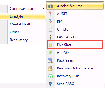 The Five Shot calculator is a short alcohol questionnaire designed to be used to recognise alcoholism in its early stages. The five-shot test is composed of two questions from the AUDIT test and three questions from the CAGE test and is intended to be a shortened version of the AUDIT test.
