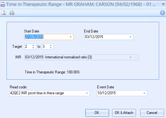- Click OK to record the score 42QE2 - INR percentage time in therapeutic range and the date, or OK & Attach to also record the questionnaire.