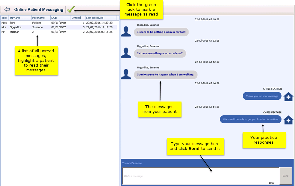 - If you have triggered the Online Patient Messaging app from Consultation Manager the patient you have selected there is automatically selected.