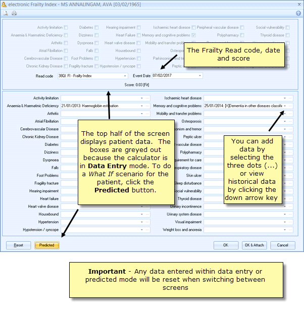 3. The Electronic Frailty Index score is automatically calculated. Click OK to record the Read code and the score or click OK & Attach to also record the form as an attachment. The Read code 38Ql.00 FI - Frailty Index is recorded in the patient's journal under Scoring Test Result.